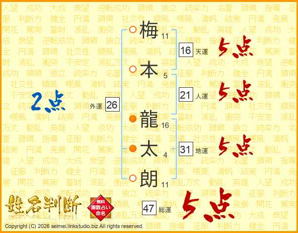 梅(11画)本(5画) 龍(16画)太(4画)朗(11画)