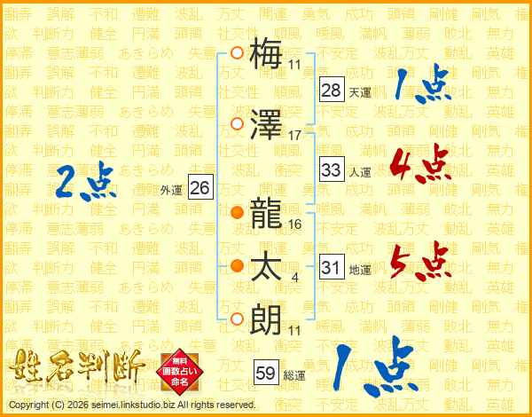 梅(11画)澤(17画) 龍(16画)太(4画)朗(11画)