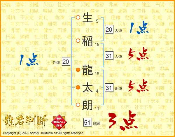 生(5画)稲(15画) 龍(16画)太(4画)朗(11画)