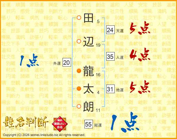 田(5画)辺(19画) 龍(16画)太(4画)朗(11画)