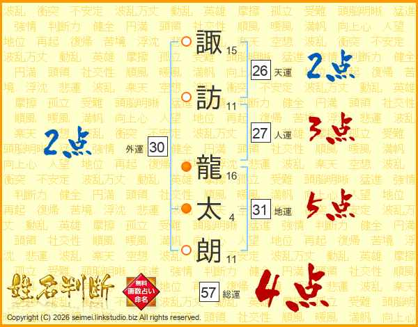 諏訪龍太朗さんの天運は26画の2点!