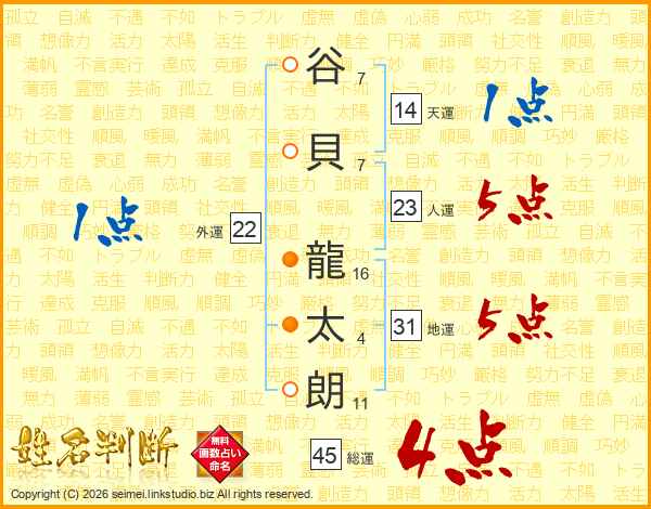 谷(7画)貝(7画) 龍(16画)太(4画)朗(11画)
