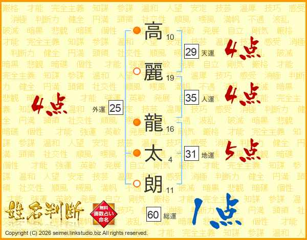 高(10画)麗(19画) 龍(16画)太(4画)朗(11画)