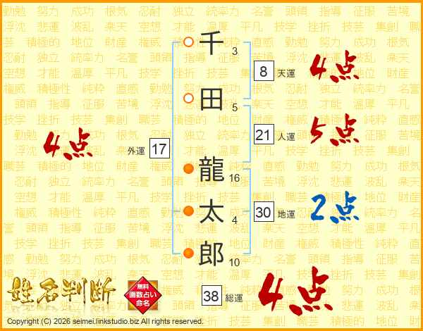 千(3画)田(5画) 龍(16画)太(4画)郎(10画)