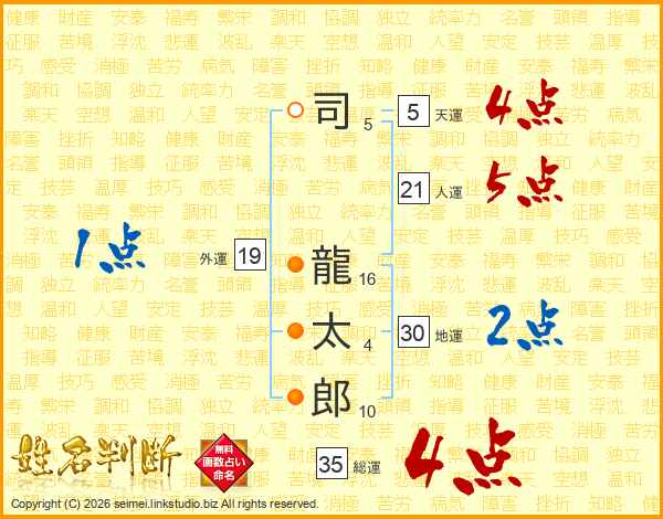 生活面を象徴する運勢です。外部から受ける影響力を表し、結婚運、家庭運や職場、環境への順応性を表します。総運から人運を引いた画数。姓や名が1文字の場合を除く。