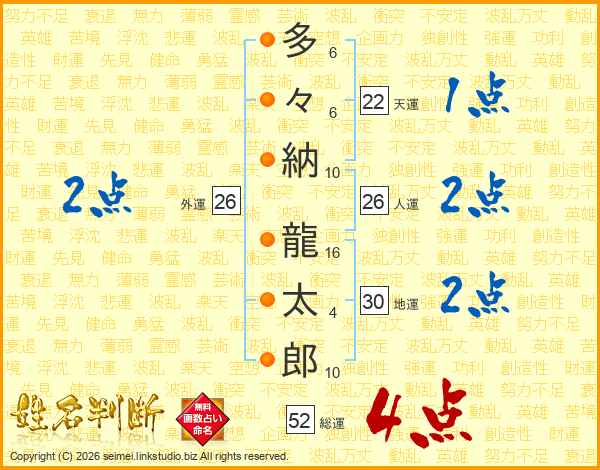 多(6画)々(6画)納(10画) 龍(16画)太(4画)郎(10画)