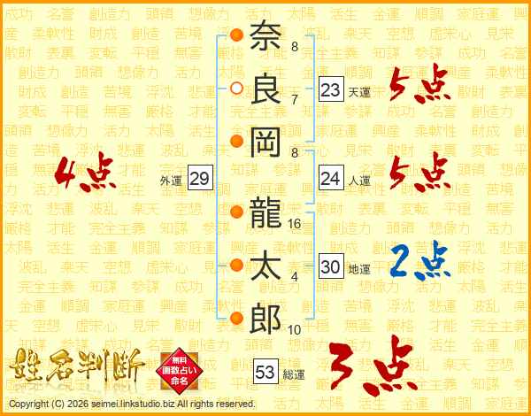 奈(8画)良(7画)岡(8画) 龍(16画)太(4画)郎(10画)