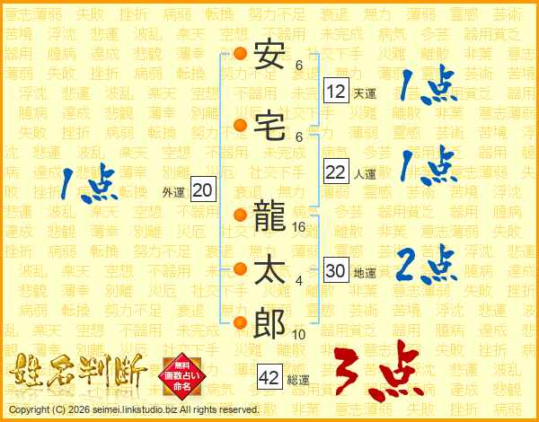 安(6画)宅(6画) 龍(16画)太(4画)郎(10画)