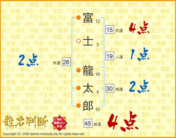 富(12画)士(3画) 龍(16画)太(4画)郎(10画)