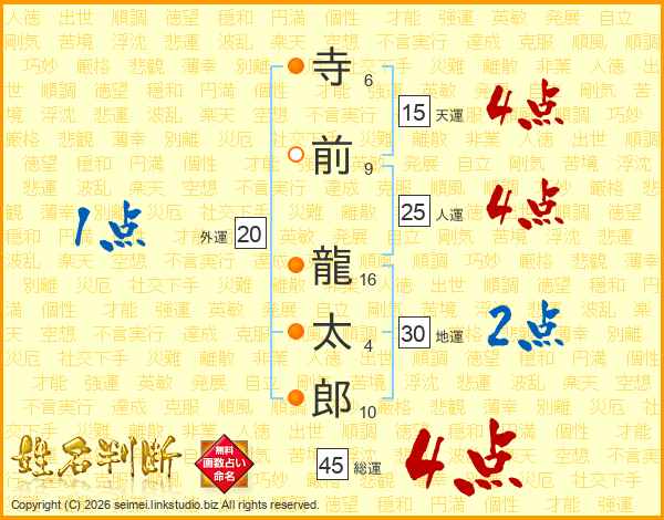 寺(6画)前(9画) 龍(16画)太(4画)郎(10画)