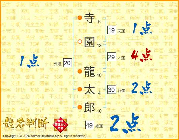 寺(6画)園(13画) 龍(16画)太(4画)郎(10画)