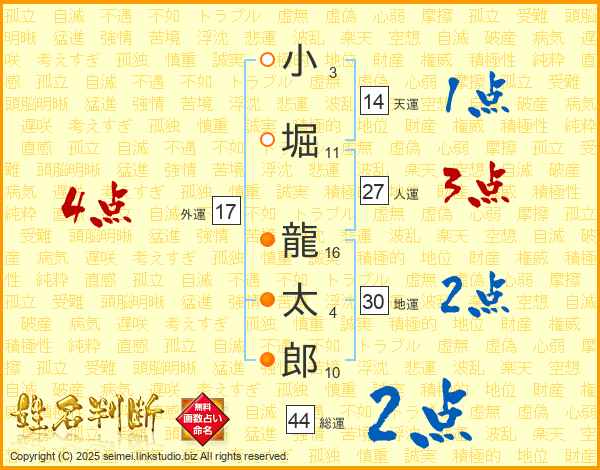 小(3画)堀(11画) 龍(16画)太(4画)郎(10画)