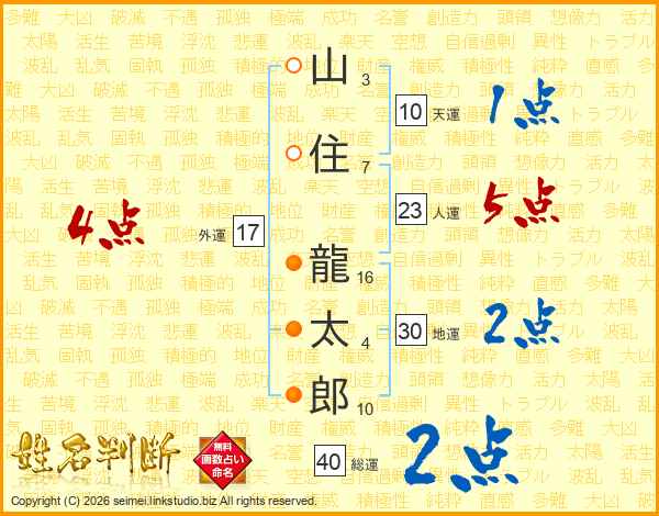 山(3画)住(7画) 龍(16画)太(4画)郎(10画)