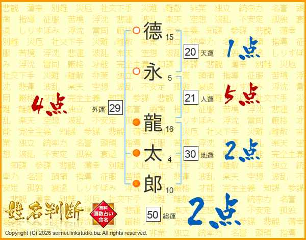 德(15画)永(5画) 龍(16画)太(4画)郎(10画)