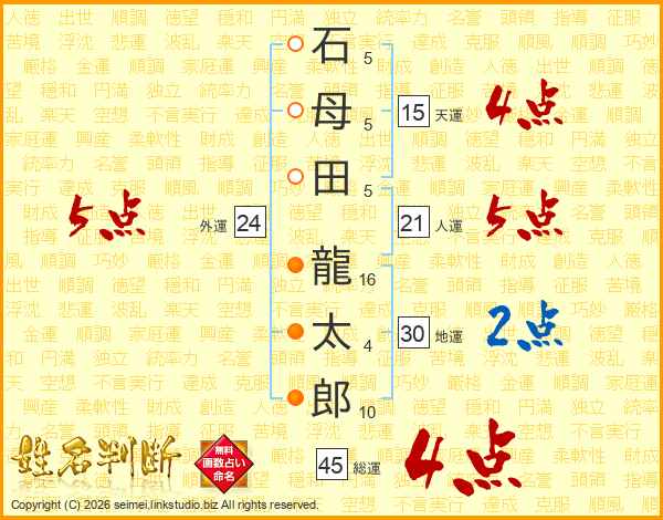 石(5画)母(5画)田(5画) 龍(16画)太(4画)郎(10画)