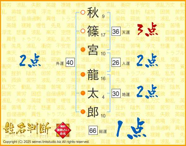 秋(9画)篠(17画)宮(10画) 龍(16画)太(4画)郎(10画)