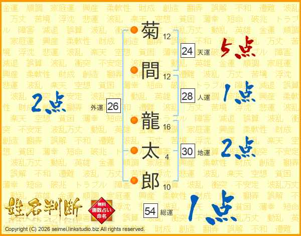 菊(12画)間(12画) 龍(16画)太(4画)郎(10画)