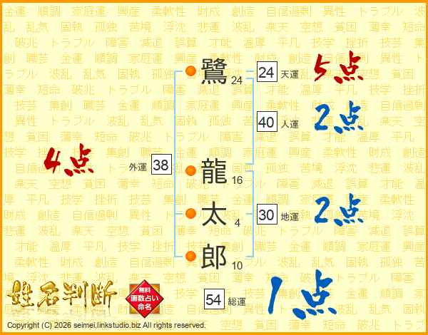 鷺(24画) 龍(16画)太(4画)郎(10画)