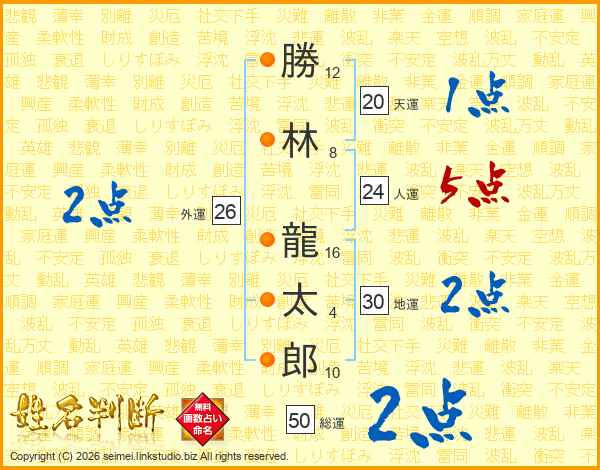 勝(12画)林(8画) 龍(16画)太(4画)郎(10画)
