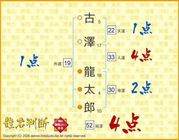古(5画)澤(17画) 龍(16画)太(4画)郎(10画)