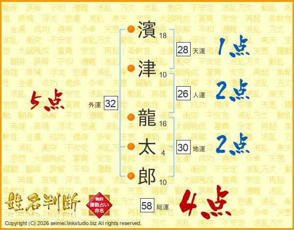濱(18画)津(10画) 龍(16画)太(4画)郎(10画)
