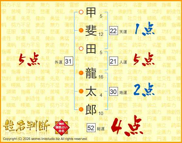 甲斐田龍太郎さんの総運は52画の4点!