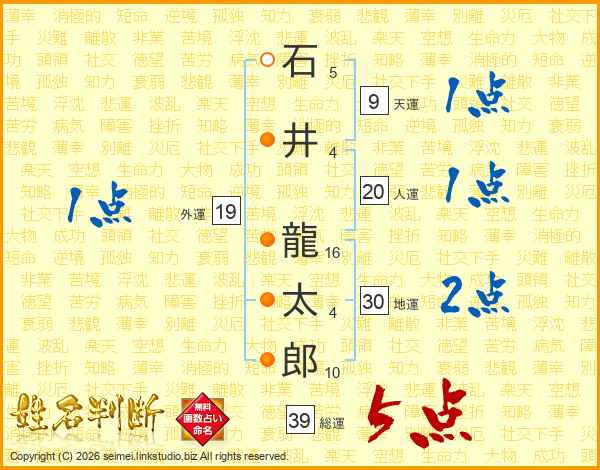 石(5画)井(4画) 龍(16画)太(4画)郎(10画)
