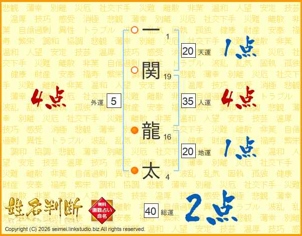 一(1画)関(19画) 龍(16画)太(4画)