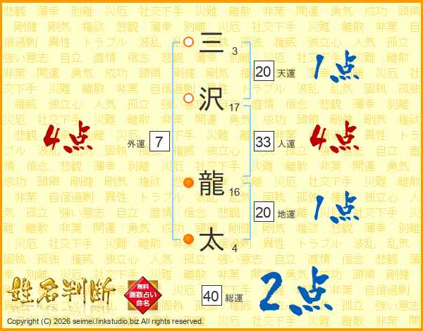生活面を象徴する運勢です。外部から受ける影響力を表し、結婚運、家庭運や職場、環境への順応性を表します。総運から人運を引いた画数。姓や名が1文字の場合を除く。