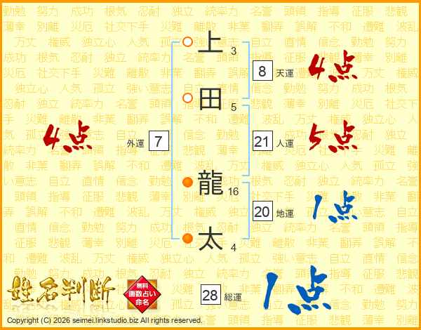 生活面を象徴する運勢です。外部から受ける影響力を表し、結婚運、家庭運や職場、環境への順応性を表します。総運から人運を引いた画数。姓や名が1文字の場合を除く。