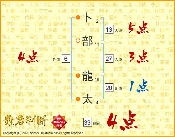 卜部龍太さんの総運は33画の4点!