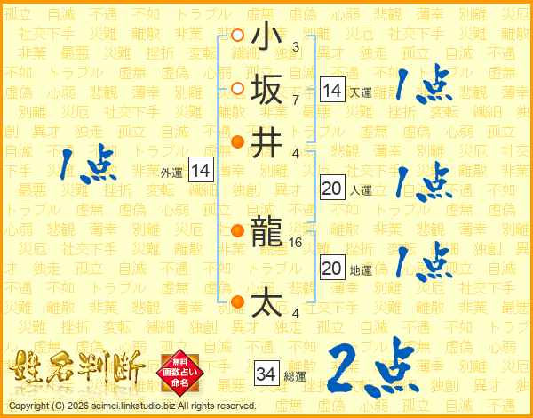 小(3画)坂(7画)井(4画) 龍(16画)太(4画)