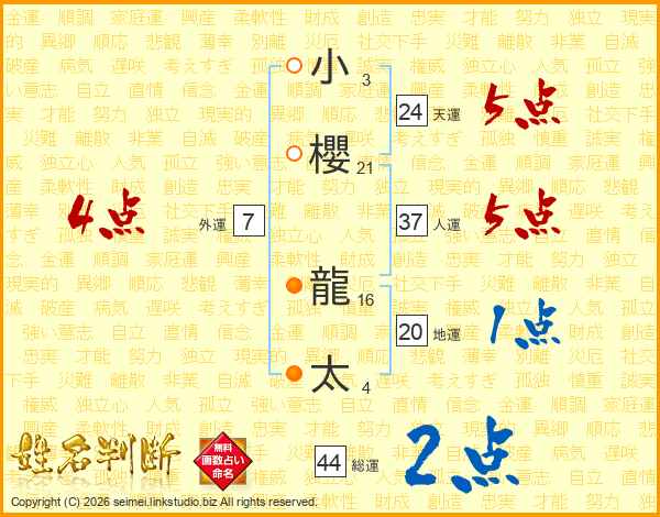 小(3画)櫻(21画) 龍(16画)太(4画)