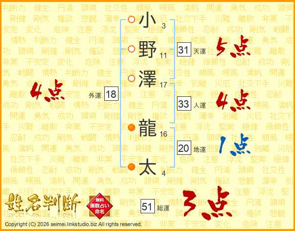 小(3画)野(11画)澤(17画) 龍(16画)太(4画)