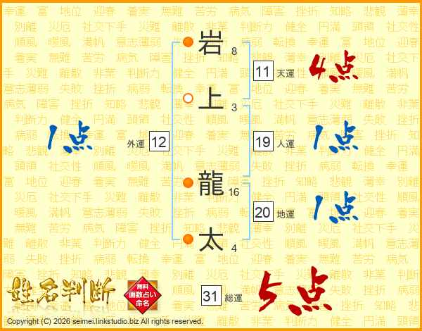 岩上龍太さんの総運は31画の5点!