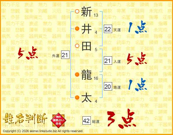 新(13画)井(4画)田(5画) 龍(16画)太(4画)