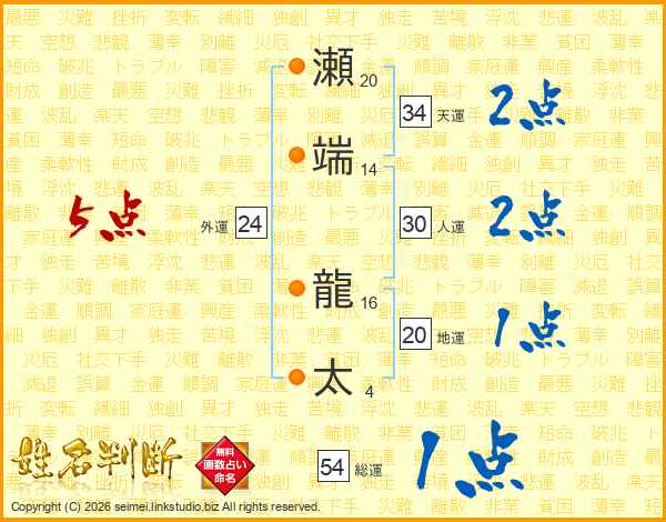 瀬端龍太さんの総運は54画の1点!