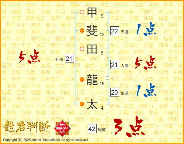甲(5画)斐(12画)田(5画) 龍(16画)太(4画)