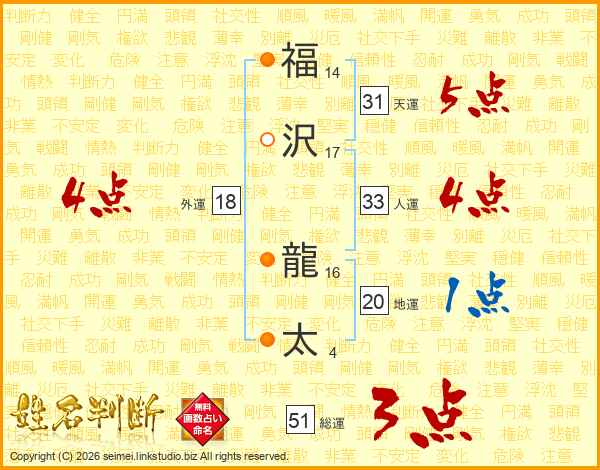 生活面を象徴する運勢です。外部から受ける影響力を表し、結婚運、家庭運や職場、環境への順応性を表します。総運から人運を引いた画数。姓や名が1文字の場合を除く。
