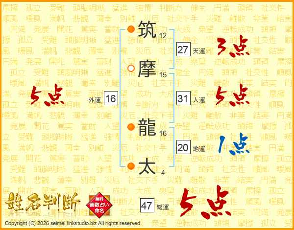 筑(12画)摩(15画) 龍(16画)太(4画)