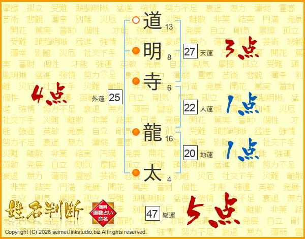 道(13画)明(8画)寺(6画) 龍(16画)太(4画)