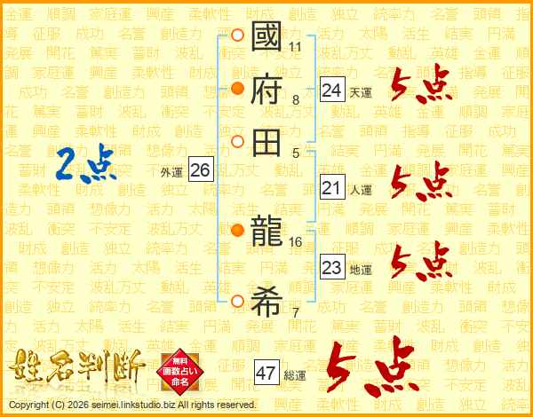 國(11画)府(8画)田(5画) 龍(16画)希(7画)