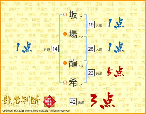坂場龍希さんの総運は42画の3点!