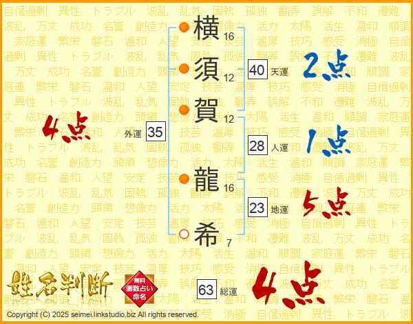 横(16画)須(12画)賀(12画) 龍(16画)希(7画)