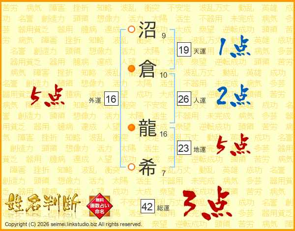 沼(9画)倉(10画) 龍(16画)希(7画)