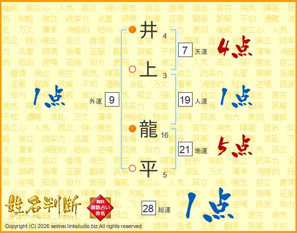 生活面を象徴する運勢です。外部から受ける影響力を表し、結婚運、家庭運や職場、環境への順応性を表します。総運から人運を引いた画数。姓や名が1文字の場合を除く。