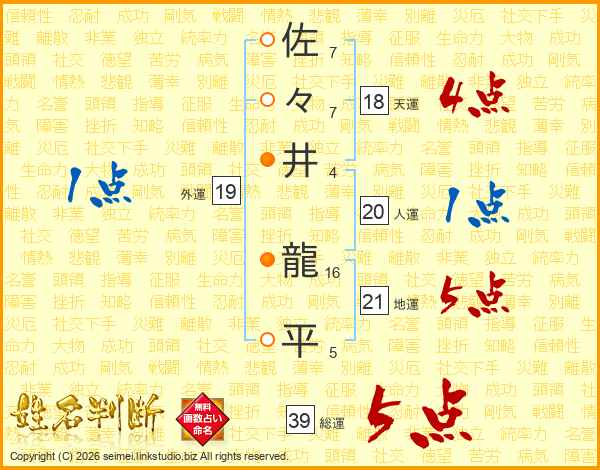 佐々井龍平さんの総運は39画の5点!