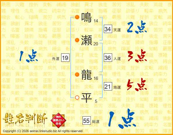 鳴瀬龍平さんの総運は55画の1点!