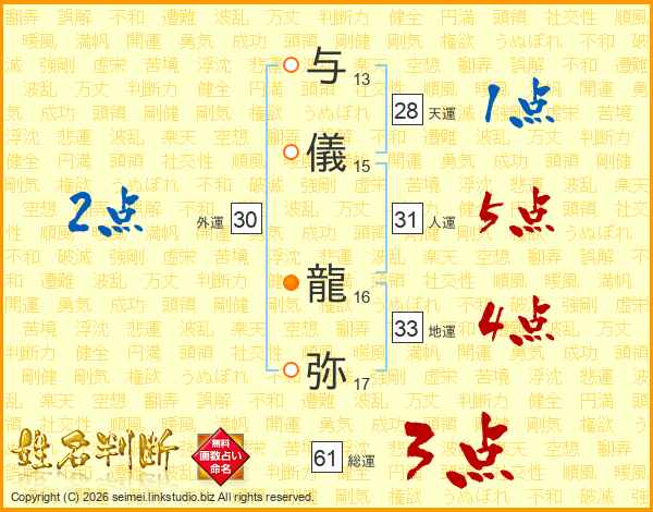 与儀龍弥さんの人運は31画の5点!