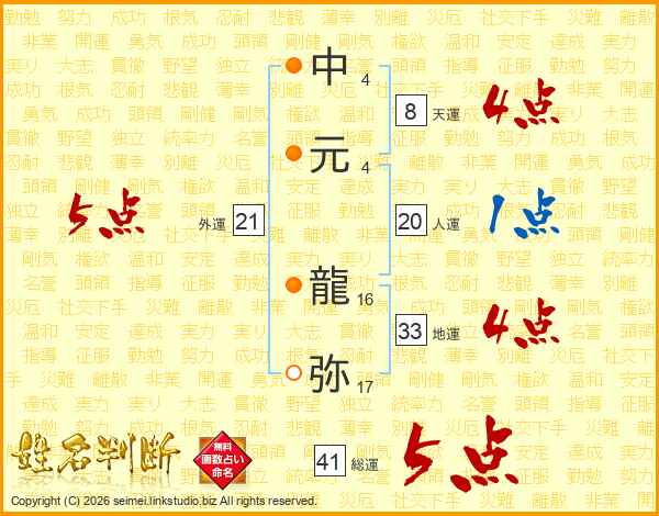 中元龍弥さんの総運は41画の5点!